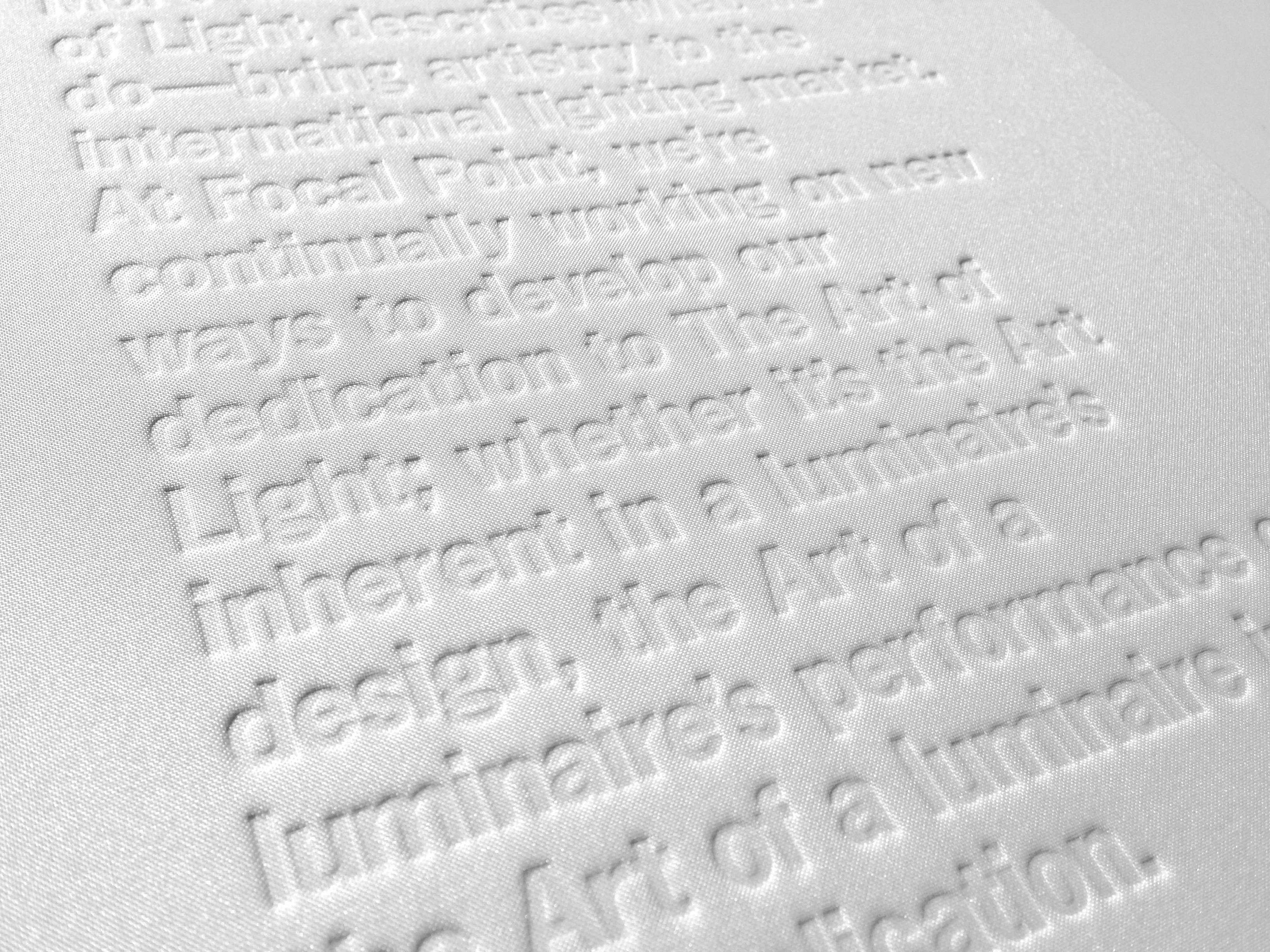 For the final volume, I designed a cover featuring Focal Point’s mission statement as a blind deboss. As light hits the surface, the text appears and recedes depending on viewing angle.